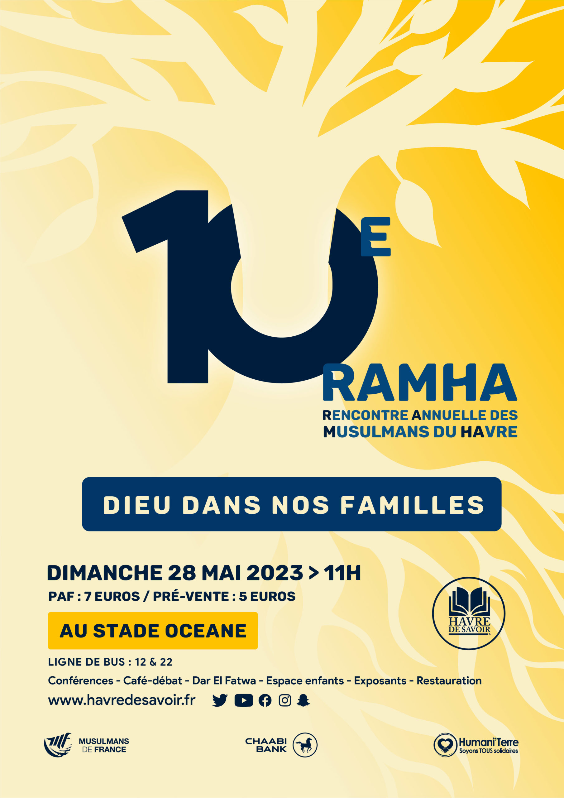 Nous sommes ravis de vous annoncer que la 10ème Rencontre Annuelle des Musulmans du Havre se tiendra le dimanche 28 mai 2023, au Stade Océane. Cette édition anniversaire est l’occasion de célébrer une décennie de rassemblement, d’échange et de partage.
