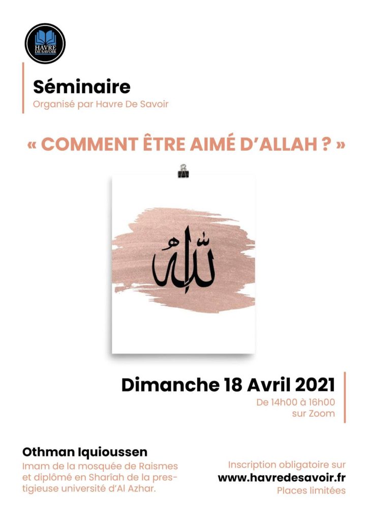 Date : Dimanche 18 Avril 2021 – Heure : De 14h00 à 16h00 – « Comment être aimé d’Allah ? » Public cible : Tous public Comment être aimé d’Allah ? Quelles actions devons-nous entreprendre pour mériter cet amour ? Quelles sont les conséquences de cet amour sur nous ? et l’impact sur notre environnement ? C’est en compagnie de Othmane Iquioussen, imam et diplômé de la prestigieuse université d’Al Azhar, que nous tenterons tous ensemble d’en savoir plus sur le meilleure chose qui puisse arriver à un être humain. Inscrivez-vous vite sur www.havredesavoir.fr ou via le lien : Cette inscription ne vaut que pour ce séminaire.
