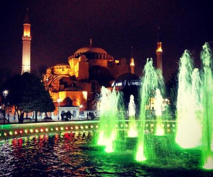 En sortant juste en face de la mosquée bleue se trouve Sainte Sophie, symbole de l’empire Byzantin, devenue mosquée à la chute de Constantinople en 1453. C’est à l’arrivée au pouvoir de Mustapha Kemal Attatürk que la mosquée fut transformée en musée. On y découvre mille et un carreaux recouverts d’or, des panneaux circulaires gigantesques sont accrochés aux quatre piliers centraux, inscrits des noms d’Allah, du Prophète de l’Islam et des quatre califes Abou Bakr, Omar, Othmane et Ali ainsi que de ceux des deux petits-fils du Prophète Bien aimé, Hassan et Hussein.