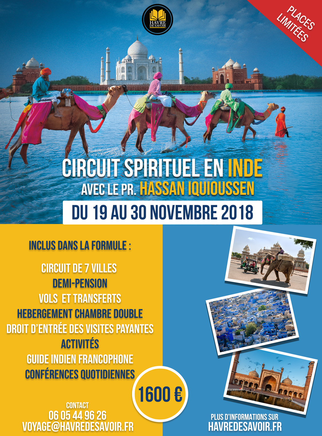 • Après-midi : Visite du temple de Bhrama et visite du Marché localCircuit Spirituel en Inde - Novembre 2018Soir : Intervention du professeur Hassan Iquioussen