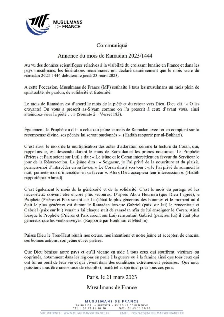 Share Share on Facebook Share on Twitter Pinterest Email AnnonceCommuniquéDatesMusulmans de Franceramadan Related Posts Retour sur la cérémonie de pose de la première pierre – Mosquée Maryam 15 septembre 2025 Communiqué – Olivier de la Paix 9 septembre 2025 Communiqué – Pose de la première pierre de la Mosquée Maryam 9 septembre 2025 Write A Comment Cancel Reply Enregistrer mon nom, mon e-mail et mon site dans le navigateur pour mon prochain commentaire. Δ Ce site utilise Akismet pour réduire les indésirables. En savoir plus sur la façon dont les données de vos commentaires sont traitées.