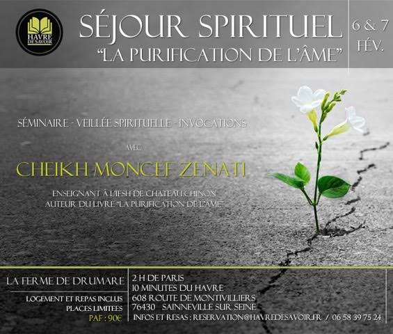 Havre de Savoir vous propose un gîte spirituel sur « La purification de l’âme » les 6&7 Février 2016 à la Ferme de Drumare. Le séjour sera animé par Cheikh Moncef Zenati (diplômé d’une maîtrise à L’IESH de Château Chinôn et auteur du livre « La purification de l’âme »). Ce séjour vous permettra d’avoir les outils nécessaires afin de vous ressourcer et réformer spirituellement. Plusieurs activités vous seront proposées: Séminaire, vidéo-débat, veillée nocturne, invocations, etc… La purification de l’âme La valeur de l’être humain réside dans cette essence spirituelle qui l’habite, qui le distingue de l’animal et qui a fait de lui un être humain ; l’âme, cette essence, en raison de laquelle Dieu a demandé aux Anges de se prosterner devant l’être humain en témoignage de son honorabilité. Sans purification spirituelle, l’islamité de l’individu est réduite à de simples rites sans âme, c’est pourquoi, la purification de l’âme est une étape obligatoire…
