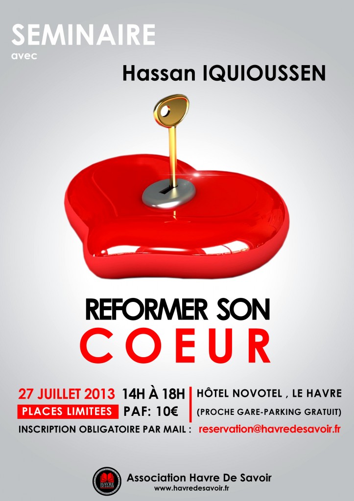 Havre De Savoir organise un séminaire qui a pour thème : « Réformer Son Cœur ». Rendez-vous samedi 27 juillet au Havre à partir de 14h00 à l’Hotel Novotel (près de la gare). Le mois de Ramadan est par excellence le mois de la réforme, c’est donc le meilleur moment pour entreprendre une réforme, un changement et une évolution positive. Pour nous accompagner dans cette démarche nous aurons l’honneur de recevoir le professeur Hassan Iquioussen. Le séminaire se déclinera en trois interventions principales : Se réformer, une obligation pour chaque musulman(e)s Les Maladies du Cœur l’exemple de Abu Hamid Al Ghazali