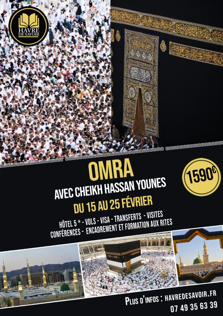 Havre De Savoir a le plaisir de vous annoncer l’organisation de sa prochaine Omra aux lieux saints de l’islam du 15 au 25 Février 2023. Le prophète (saw) a dit :« Entre deux Omra, Dieu absout tous les péchés alors que le pèlerinage pieux n’a de véritable rétribution que le Paradis » (Rapporté par Al Boukhari et Mouslim) Présentation de l’invité d’honneur L’accompagnateur pour cette expérience inoubliable sera l’Imam Hassan YOUNES, Imam de la Mosquée de la paix de Beauvais, également enseignant chercheur en nutrition. Dr Hassan YOUNES et également membre du groupe interreligieux des Croyants Unis Pour La Paix. Il encadrera notre groupe à travers ses explications et ses enseignements notamment durant ses interventions conférences quotidiennes. Détails du séjour Séjour ‘Omra Formule Luxe en 5* Du 15 Février au 25 février 2023 Départ depuis Paris Charles De Gaulle – Vol avec Turkish Airlines + Tous les transferts internes en Car Climatisé + Hébergement (en formule…
