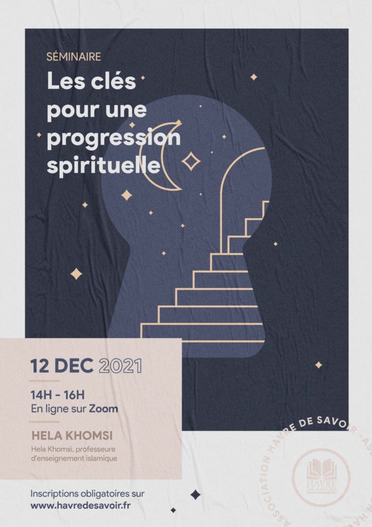 Cheminer vers Dieu et se rapprocher chaque jour un peu plus de Lui: tel est le but du croyant. Entre la volonté de bien faire, la routine, les tentations et les épreuves de cette vie, comment progresser spirituellement et cheminer sereinement vers notre Créateur? Conscients de cette importance d’être, chaque jour que Dieu fait, la meilleure version de nous-même, comment réussir à développer notre foi et notre spiritualité? Quelles sont les causes par lesquelles nous pouvons améliorer notre relation à Allah (swt)? Quels sont les moyens nous permettant de lutter contre la stagnation voire la perte de vitesse dans notre cheminement? Pour nous accompagner dans cette quête de progression et d’amélioration spirituelle, nous vous proposons un séminaire où nous aurons l’honneur d’avoir les précieux conseils de Hela KHOMSI (professeur d’enseignement islamique). Si cette thématique vous intéresse, nous vous donnons rendez-vous dimanche 12 décembre 2021 de 14h00 à 16h00 sur « Zoom »;…