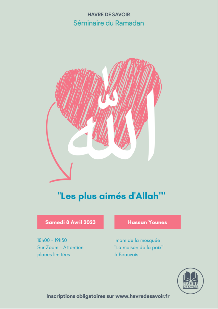 Nous cherchons toutes et tous à être aimés de Dieu. Allah (swt) notre Créateur nous a donné tellement de bienfait que nous ne pouvons que L’aimer et rechercher Son amour. Comment être aimé Allah (swt) ? Quels sont les conséquence de cet amour divin sur notre vie et notre personne ? La réponse dans ce séminaire avec cheikh Hassan YOUNES, imam de la mosquée de « La maison de la paix » à Beauvais que nous traiterons de ce sujet. Nous vous donnons rendez-vous samedi 8 avril 2023 de 18h00 à 19h30 sur « Zoom ». Les places étant limitées, l’inscription est obligatoire.