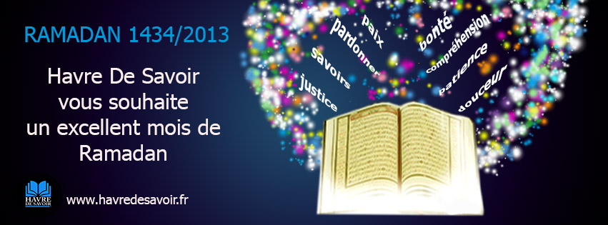 Havre De Savoir vous souhaite un excellent mois de Ramadan 2013, qu’ALLAH vous permette d’en profiter pleinement, de l’adorer, d’atteindre l’objectif pour lequel Il l’a instauré, de nous affranchir de Son enfer et de gagner Son paradis inch’Allah.