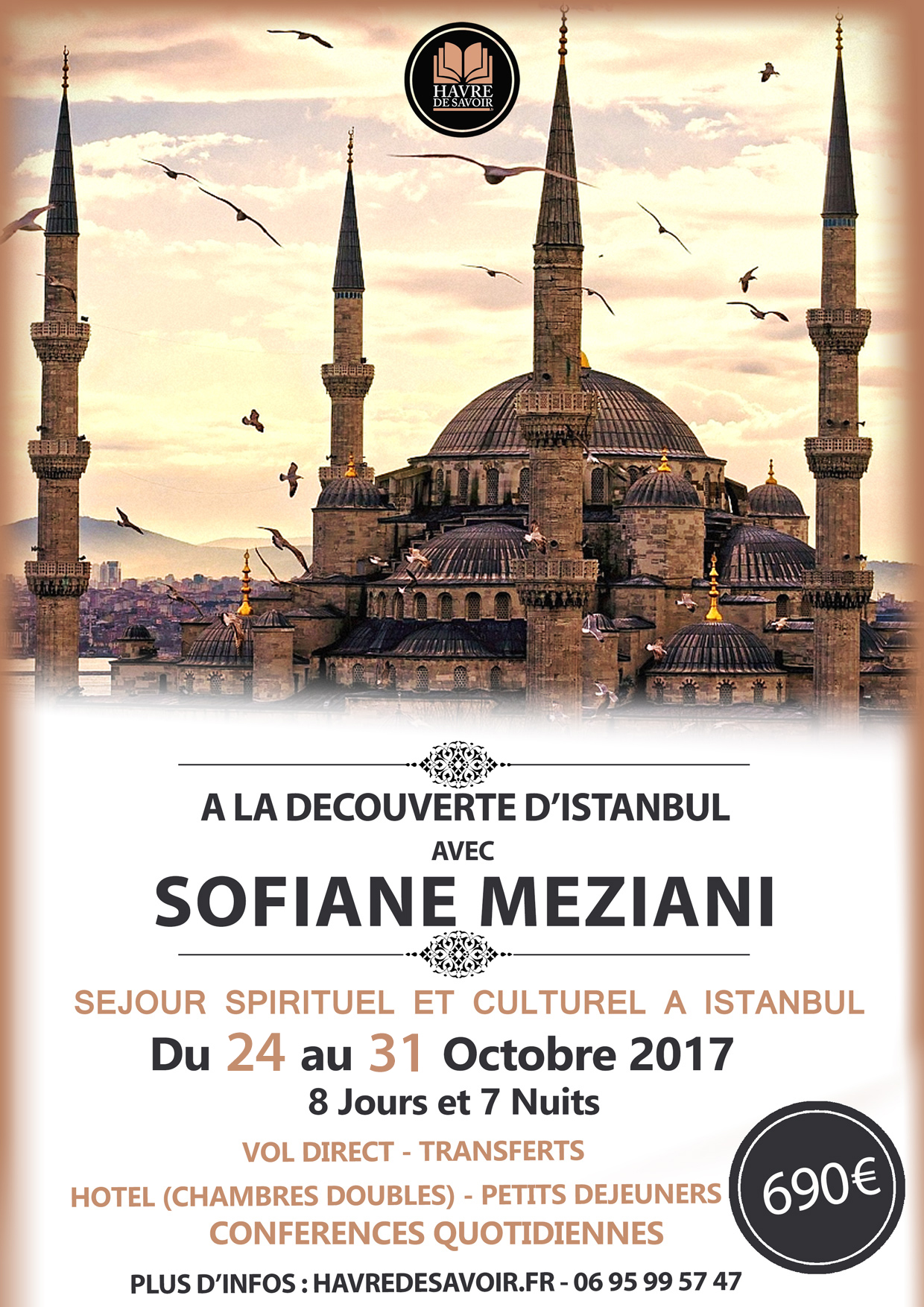 690€ : Vol avec Turkish Airlines + Transferts (Aéroport Istanbul – Hôtel – Aéroport Istanbul) + Hébergement 7 nuits à l’Hôtel Olimpiyat (qui se trouve à 5 minutes de marche de la Mosquée Bleue) + Petit-Déjeuner (Buffet à volonté) + Intervention quotidienne du professeur Sofiane MEZIANI + Encadrement Havre de Savoir