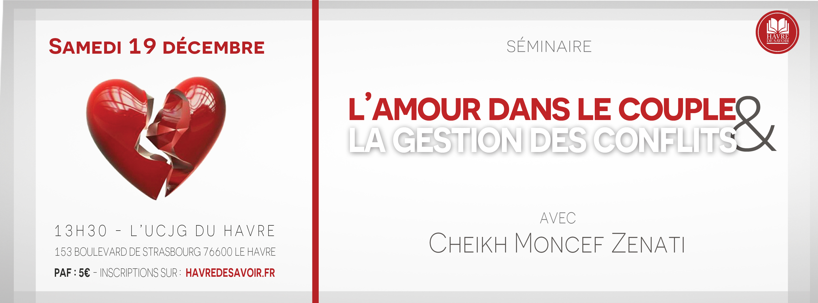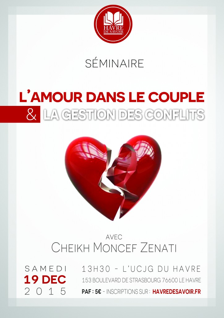 Afin d’approfondir ce sujet, nous vous invitons à un séminaire qui aura pour thème « L’amour dans le couple et la gestion des conflits ». Le séminaire aura lieu le samedi 19 décembre 2015, de 13h30 à 18h à la salle de L’UCJG du Havre – 153 Boulevard de Strasbourg, 76600 Le Havre.