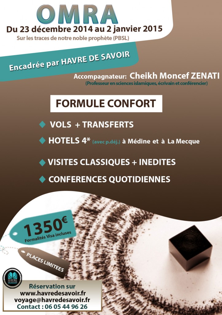 Havre de Savoir a le plaisir de vous annoncer l’organisation d’une ‘Omra aux lieux saints de l’islam du 23 décembre 2014 au 2 janvier 2015.
