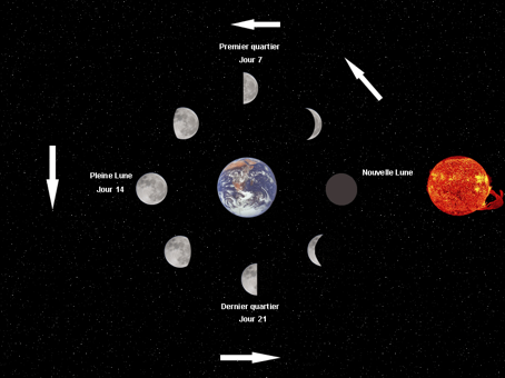 La Lune gravite autour de la Terre et durant sa période de révolution nous la voyons sous différents aspects. Ces phases lunaires (voir image ci-dessous) vont de la nouvelle Lune, où on ne voit pas de Lune dans notre ciel, jusqu’au croissant grandissant puis au quart de Lune, puis la pleine Lune, et enfin l’enchaînement dans le sens inverse.