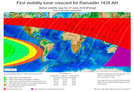 La carte de visibilité du croissant pour le début du mois de Ramadhan de l’année 2014 obtenue grâce aux critères de la loi du 9 mai est donnée ci-dessus.