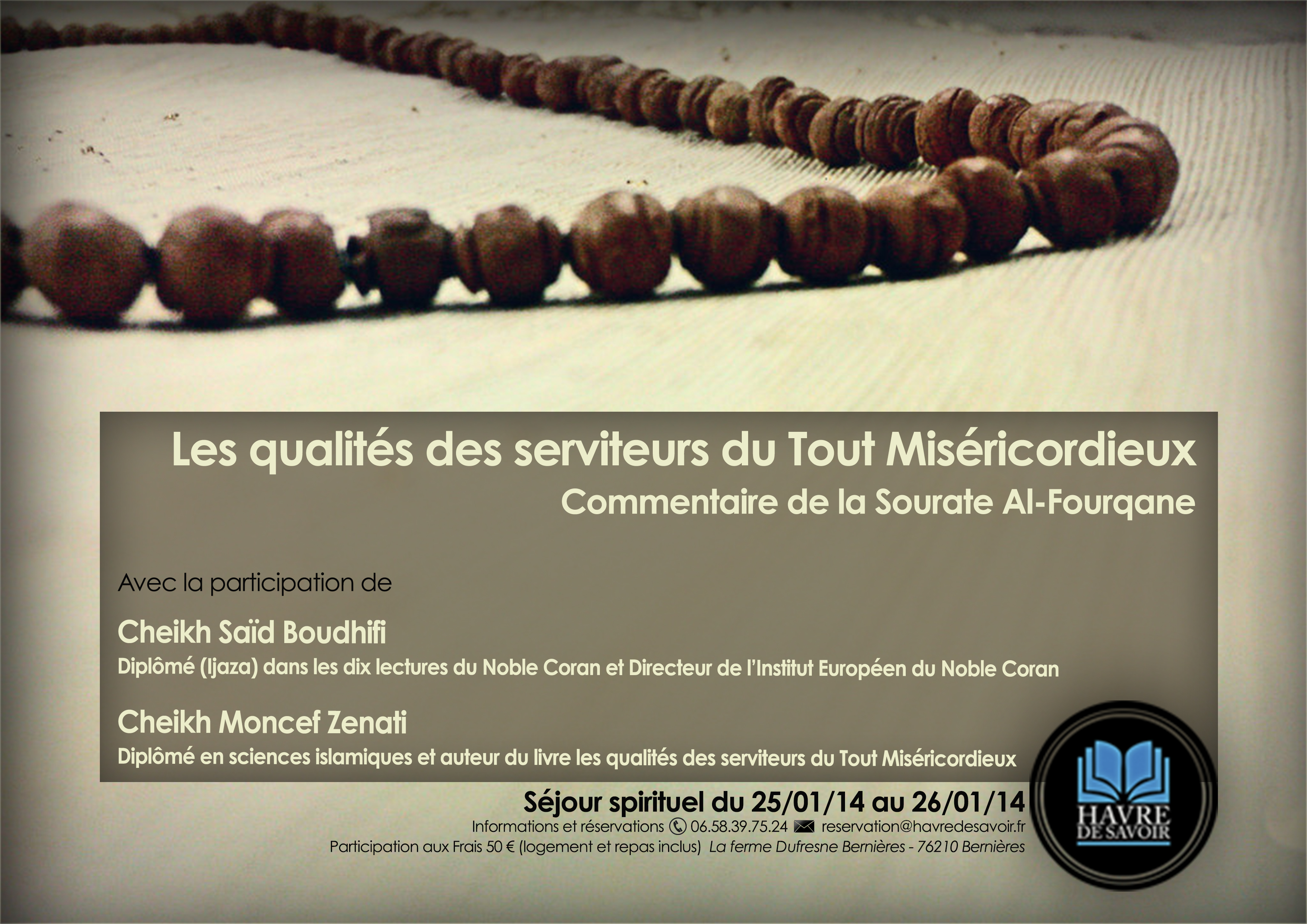 Le séjour spirituel de Havre De Savoir aura lieu du 25/01/14 au 26/01/14. Le thème sera: les qualités des serviteurs du Tout Miséricordieux (Commentaire de la Sourate Al Fourqane)