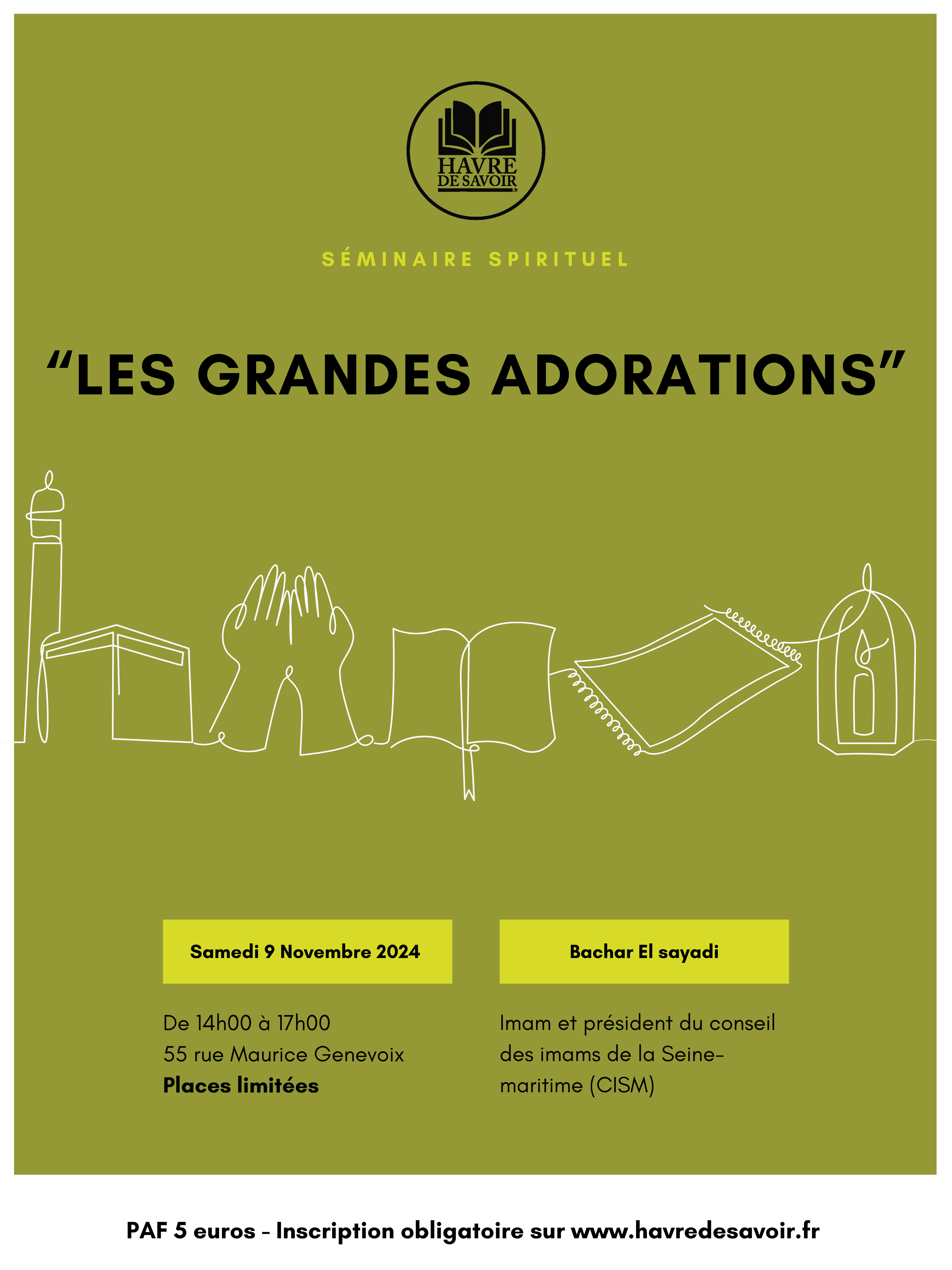Nous avons le plaisir de vous inviter à un séminaire exceptionnel qui se tiendra le 9 novembre, portant sur le thème des grandes adorations en Islam. Cet événement sera une opportunité unique pour tous ceux qui souhaitent approfondir leur compréhension des actes fondamentaux de l’adoration dans notre belle religion, tels que la prière, le jeûne, l’aumône et le pèlerinage.