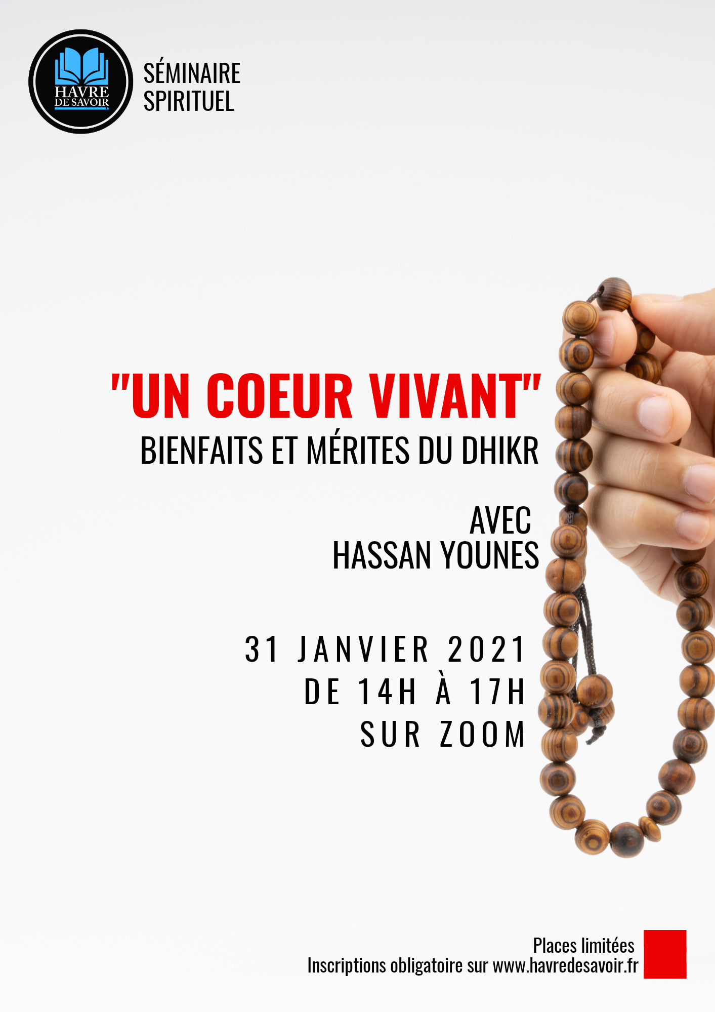 Nous vous proposons de méditer et d’échanger sur cette source de tranquillité et d’apaisement pour le cœur, dimanche 31 Janvier 2021 de 14h00 à 17h00 avec Hassan Younes (Docteur en nutrition et Imam à la mosquée de Beauvais).