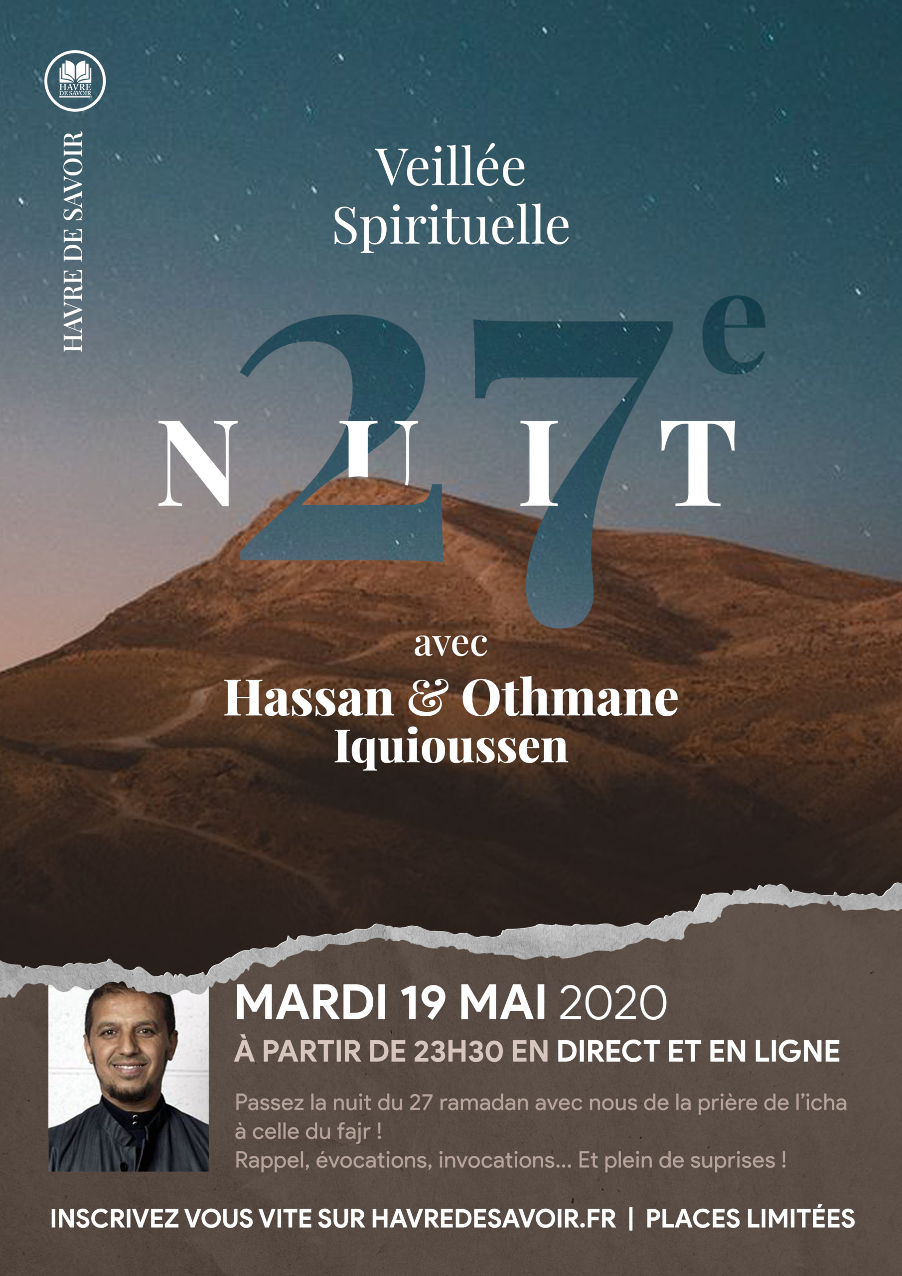 Inscription sur : https://www.helloasso.com/associations/havre-de-savoir/evenements/soiree-spirituelle-du-27-ramadan-avec-hassan-iquioussen